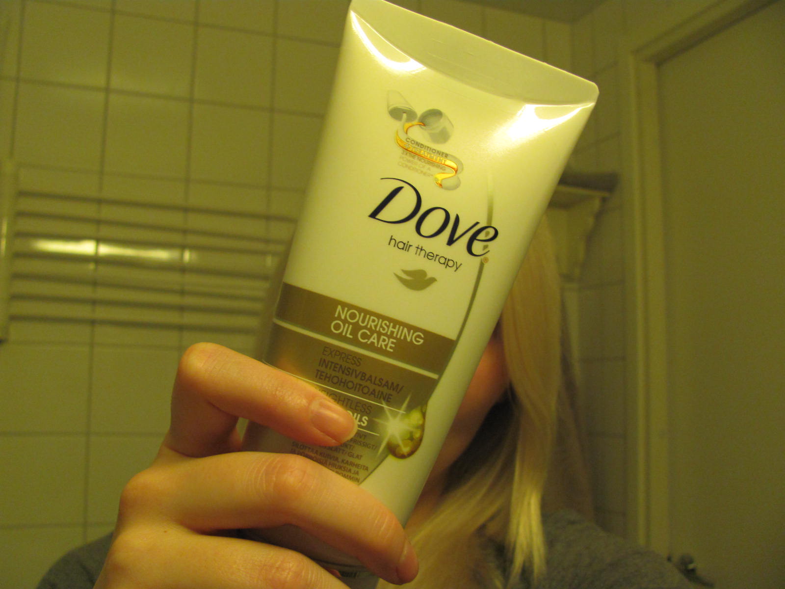 Eilen kokeilin tätä Doven nourishing oil care -hoitoainetta ensimmäisen kerran. Ensimmäisen kokemuksen perusteella voisin todeta, että tuote jättää hiukset ihanan pehmeiksi ja helposti käsiteltäviksi, mutta pörröisyys pysyi edelleen ihan samanlaisena. Toisaalta pesin hiukset aamupäivästä, ja vaikka olin käynyt koiran kanssa ulkona pipoa pidellen ja muutenkin touhuillut kaikkea, olivat hiukset vieläkin ihan siistit illalla, eivätkä juurikaan sojottaneet joka suuntaan. Eli ensivaikutelma tuotteesta on: HYVÄ. :)