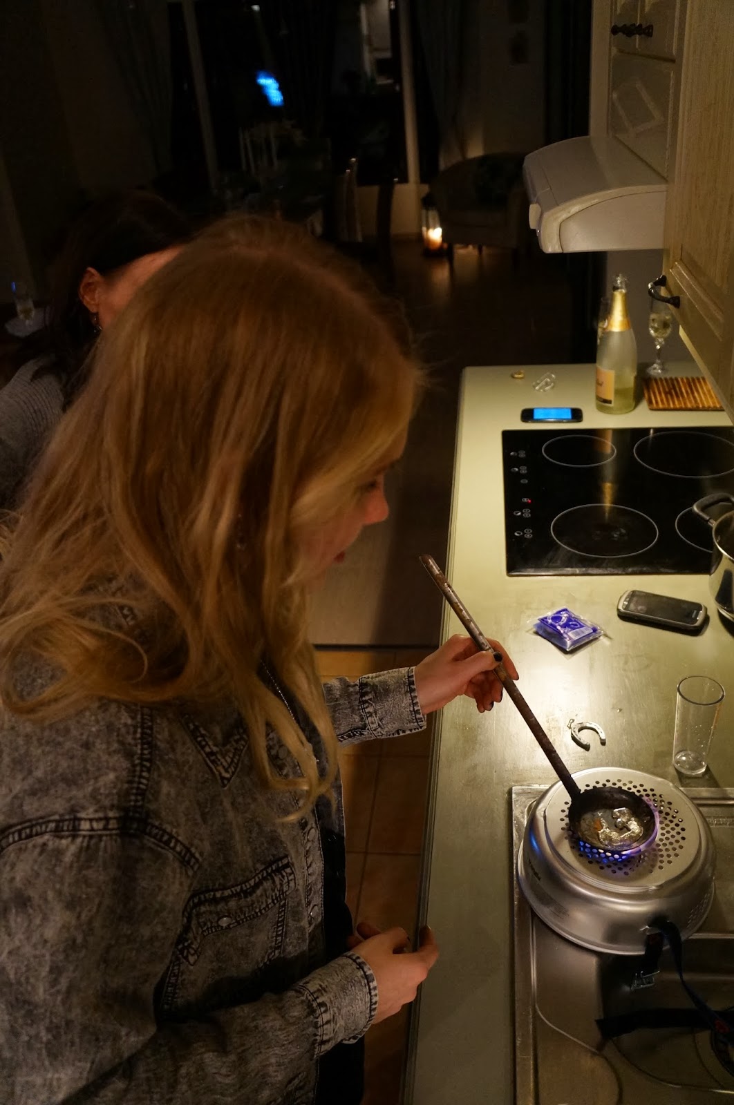 Tinausta koitettiin ensin perinteisesti liedellä, mutta eihän se tietenkään induktioliedellä onnistunut. Seuraavaksi kokeiltiin vesihauteessa kattilassa :D No eipä se riittävän kuumaksi siinä tietenkään tullut. Kynttilän liekkikin pääsi kokeiluun, mutta lopulta isä muisti olemassa olevan trangian, jolla saatiin nopeasti tinat sulatettua ja valattua.
